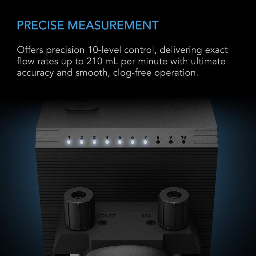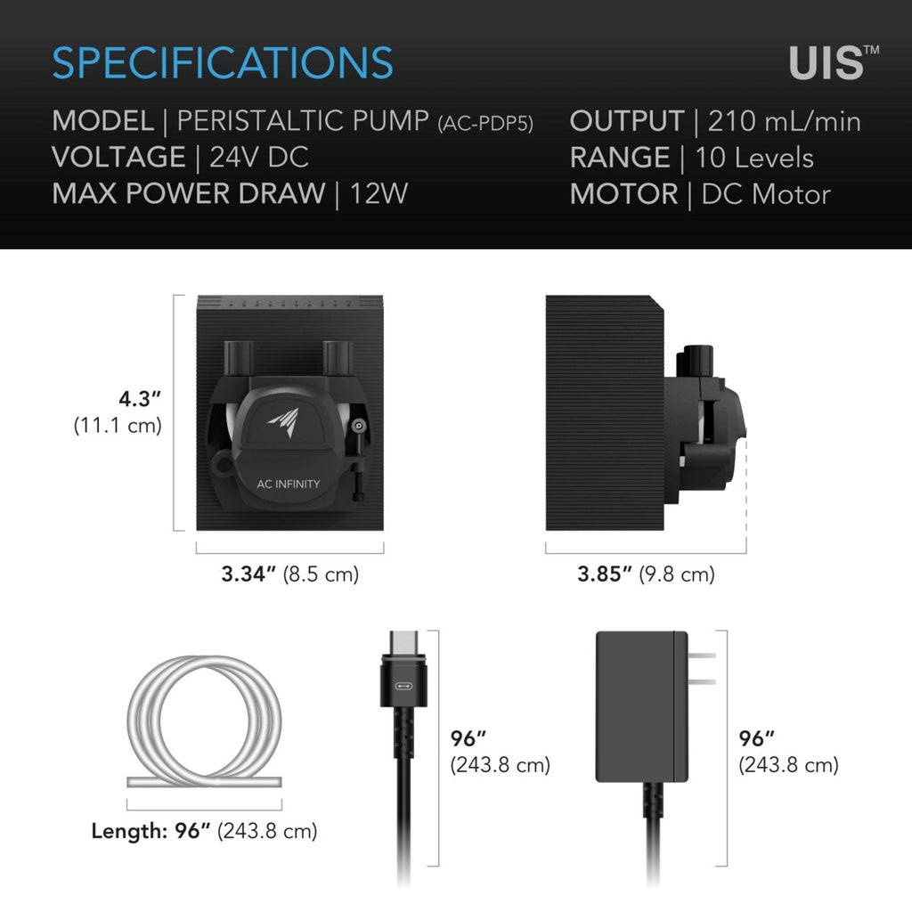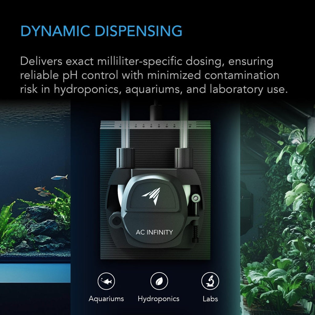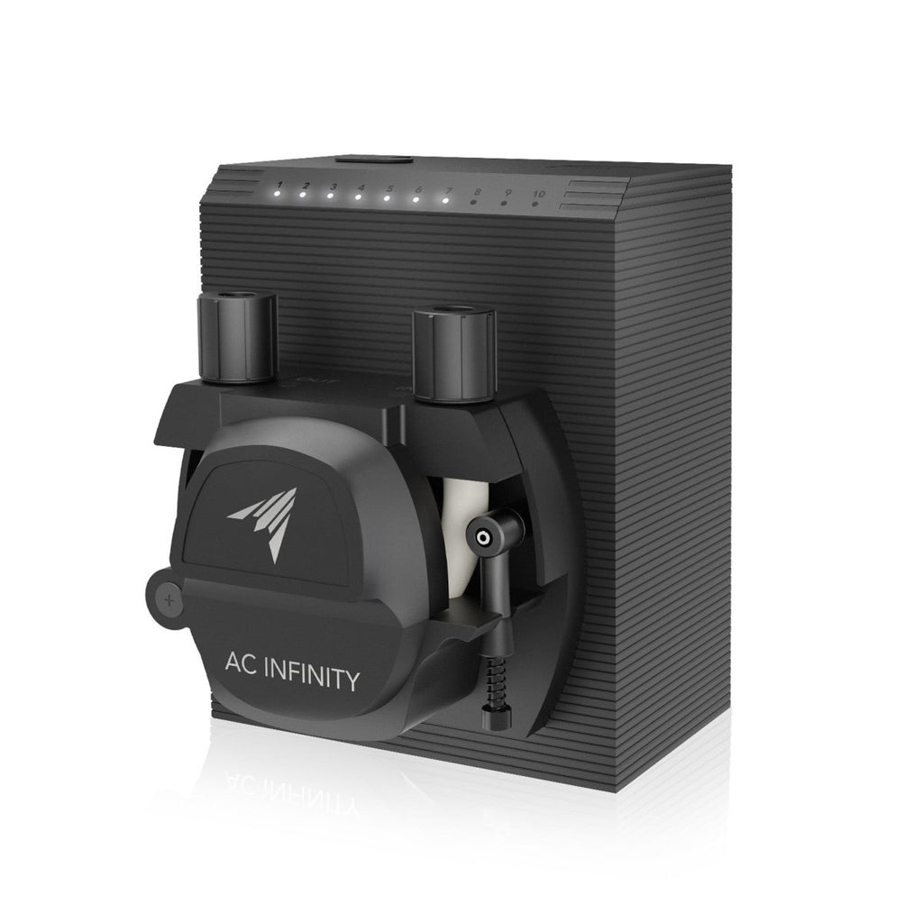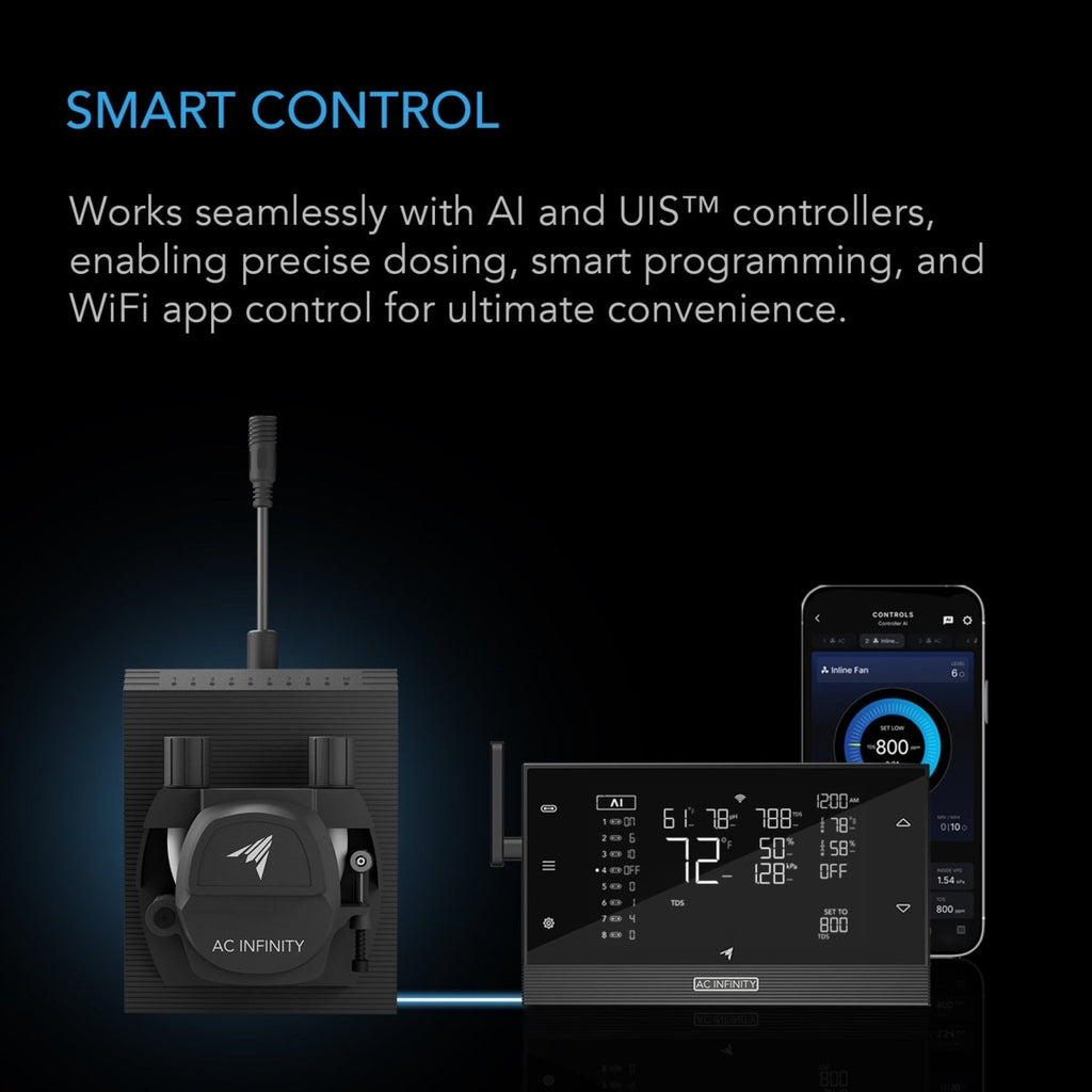 This peristaltic dosing pump distributes precise amounts of liquid for accurate pH and nutrient control in hydroponic, aquarium, and laboratory applications. Using this pump system will ensure your liquids only pass through the included tubing so your solutions receive proper dosing. Operating with milliliter-level precision, it delivers exact flow rates with a 10-level adjustable system, dispensing 21 mL intervals up to 210 mL per minute. Powered by a high-efficiency DC motor, it runs quietly and energy-efficiently for long-term reliability. This product is a part of the UIS™ platform of grow devices and smart controllers, designed to unite with the AC Infinity app over WiFi to achieve your ideal environment. This smart ecosystem of grow devices can continue to run even if it is disconnected from your WiFi, keeping your grow safe and thriving.